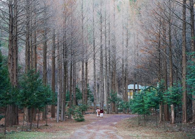 주차장에 차를 대고 약 500m 걸으면 소형 사방댐이 나오고, 건너편에 자리 잡은 예쁜 2층 목조 주택이 잔잔한 수면에 비친다. 노란색 외관과 주변의 메타세쿼이아 숲이 푸른 물에 비친 모습이 꽤 이국적이다. 특히 오후 햇살에 더욱 따사롭게 보여 해질 무렵 찾는 사람이 많다. 이 집 역시 숙박시설이 아니라 휴양림 소유의 개인 별장이다. 사방댐 위쪽에도 메타세쿼이아 숲길이 조성돼 있다. 사진이 목적이 아니어도 걷기 좋은 숲이다. 아직까지 입장료는 받지 않는다.