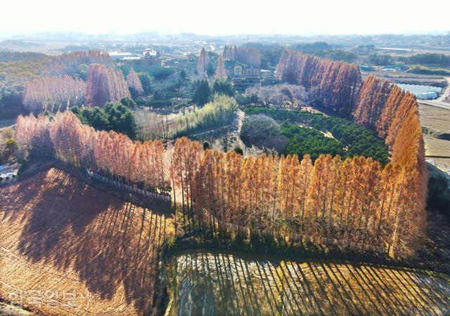 울타리 삼아 심은 500여 그루 메타세쿼이아가 성벽처럼 정원을 감싸고 있다. 일직선으로 늘어선 아름드리 나무 기둥이 위풍당당하다. 잎이 거의 떨어졌지만 수많은 잔가지로 형성된 원추형 수형이 기하학적 아름다움을 뽐낸다. 고대 건축물의 회랑을 따라 걷는 듯하다. 50년 세월이 빚은 자연의 작품이다.