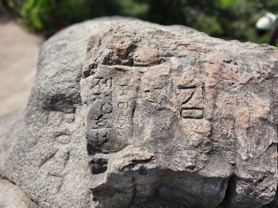 정상에 있는 알바위. 명식, 제정흡, 조민곤 세 명의 이름이 파여져 있다. 한 사람은 돌을 쪼다 말았는지 성만 새겨놓았다.