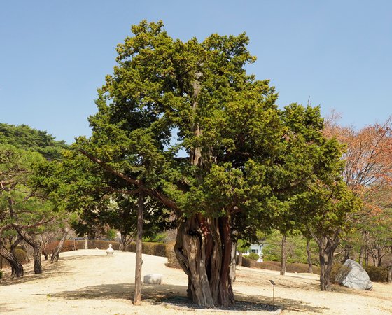 수궁터에 있는 주목. 줄기가 붉다. ‘살아 천년, 죽어 천년, 썩어 천 년, 합해 삼천년을 간다’는 청와대에서 최고참 나무다. 743세(2022년기준) 잡수신 왕할아버지다. 그 왼쪽에 구 청와대 본관 터임을 표시한 호리병조각이 있다.