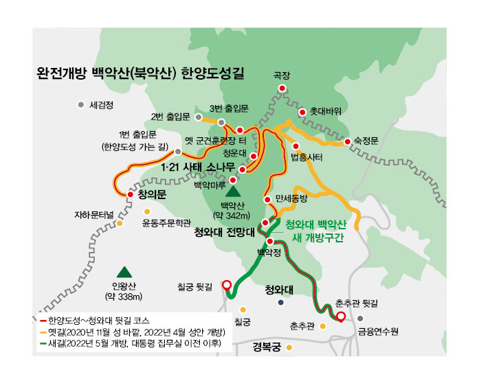 민간인 출입이 통제됐던 한양도성은 조금씩 시민 곁으로 돌아왔다. 1993년 문민정부가 출범한 이후 인왕산 일부가 열렸다. 백악산 개방을 시작한 시기는 노무현 정부 때였다. 문재인 정부에 이르러 백악산 일대 한양도성길을 사실상 전면 개방했다. 문재인 정부는 2017년 청와대 앞길, 2018년 인왕산길, 2020년 한양도성 바깥길(백악관 북쪽), 2022년 4월 한양도성 안길(백악산 남쪽)을 열었다. 윤석열 대통령이 5월10일 청와대를 떠나 용산 집무실로 옮기자, 청와대 뒷길까지 시민의 공간이 됐다.